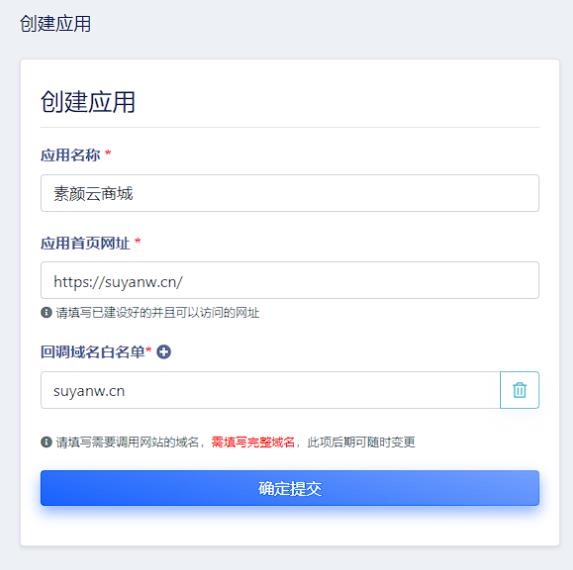 应用名称:填写自己网站名称。如:素颜云商城