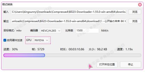 6. 格式转换:若默认下载MP4格式不满意,可随时切换编码及视频格式重新输出。另支持硬件显卡GPU加速处理。