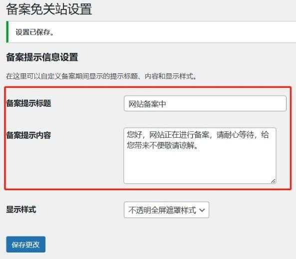 免关站展示:开启插件后,非管理员用户访问网站时,会看到以半透明遮罩层或不透明全屏遮罩样式呈现的备案提示信息,让访客知晓网站正在备案,无需关闭网站影响正常运营。
