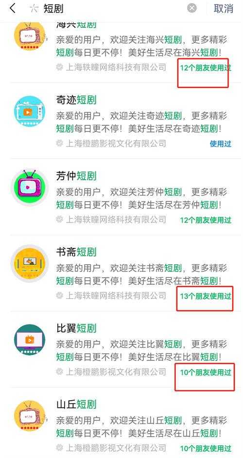 这个玩法类似小说,就是把小说视频化,看这样的短视频确实会上瘾,后面知道这个玩法是短剧后,还知道他们在微信上主要是小程序,我就去搜索短剧,不搜不知道,搜索发现,玩法真牛逼,霸屏操作,一个公司注册几十个账号,操作这个项目。