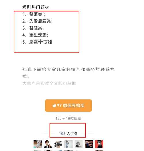 这里可以确定的是,短剧确实可以分销,可以赚钱,不然没有那么多公司疯狂的投钱,这是目前火的一个领域,很多大公司都开始投入这个领域,这样的短剧看起来比小说舒服,标题说的是我被割了,其实我赚了,我知道还可以借助这个玩法赚钱。我花了9.9元,我知道这个可以玩,以后我找到一些需求的时候,我找到答案,我就设置付费阅读,标题就是别人搜索,就是别人想看到的,是不是就可以赚钱呢,比如某某领域的内部资料,是不是可以这样设置操作呢?
