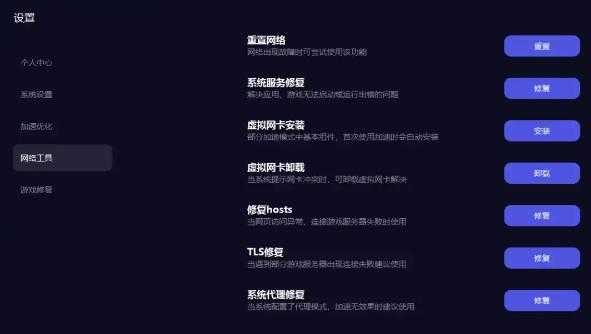 同时也和其他加速器一样拥有网络工具和游戏修复功能,比如网络重置、系统修复、hosts修复、TLS修复、平台异常修复等等,主打一条龙服务,保障大家的网络安全,流畅游玩任何游戏。
