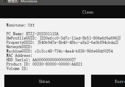 所有软件需要解压后管理员启动使用!feng过号的玩家优先用,feng号文件清理 ,登录软件后等几秒钟,点击下方Enter,然后点击左下方的Unban(会跳出黑框表示正在进行),进行完毕后机器码会更改并且 上方Monotone右侧的off会变成on,显示on即为过机器码成功 关闭软件后上游戏即可(每次重启电脑都要重新开启)