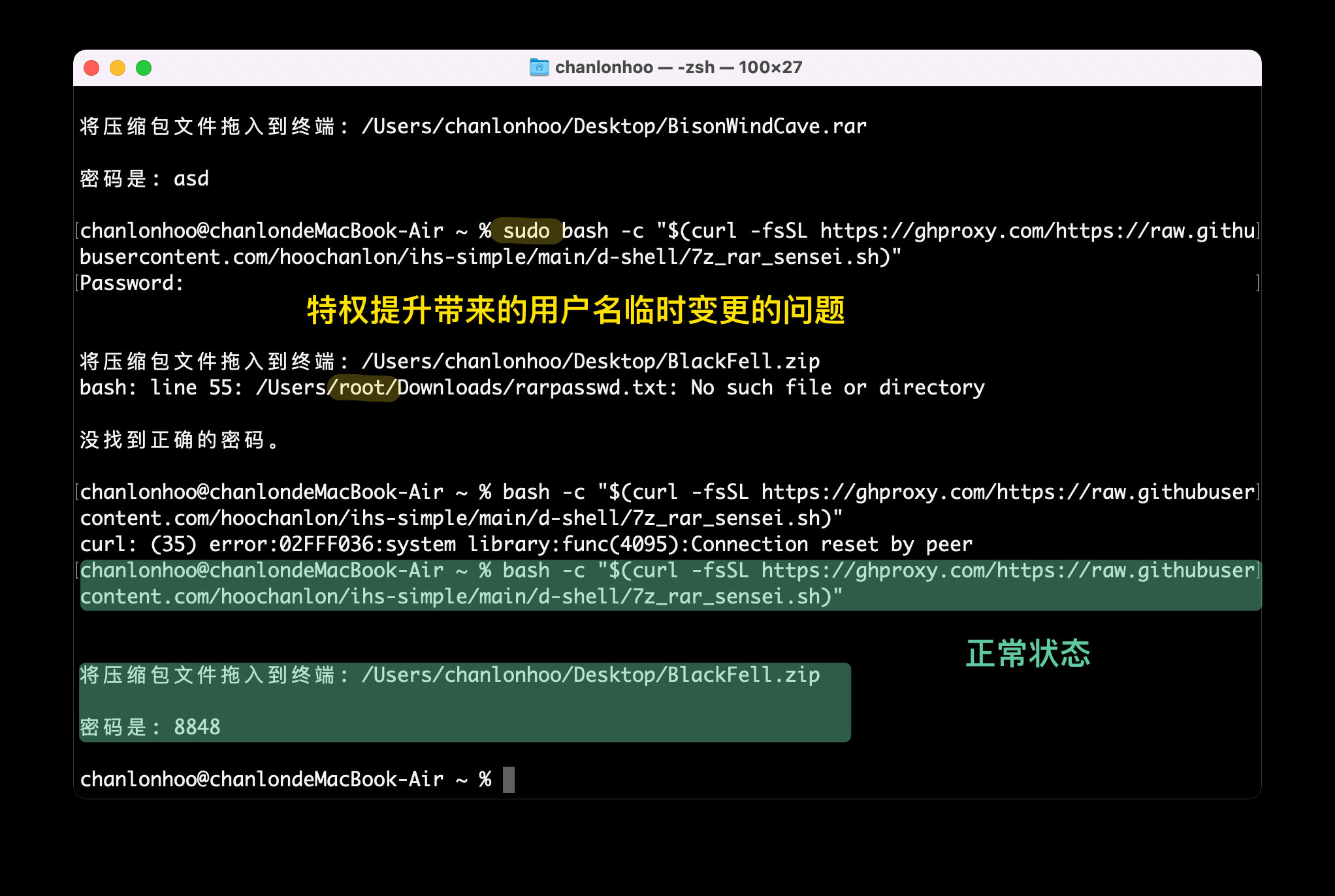 # 无法输出用户名 // ,储存变量结果后,再输出 /Users/<用户名> 正常。