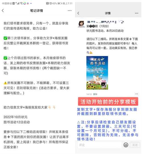 他们吸粉裂变规则设计很简单,就是将编辑好的文案和海报,转发到朋友圈。条件是不可设置屏蔽、三天可见,不可分组,不可删除,否则视为无效,无法参加领书活动。