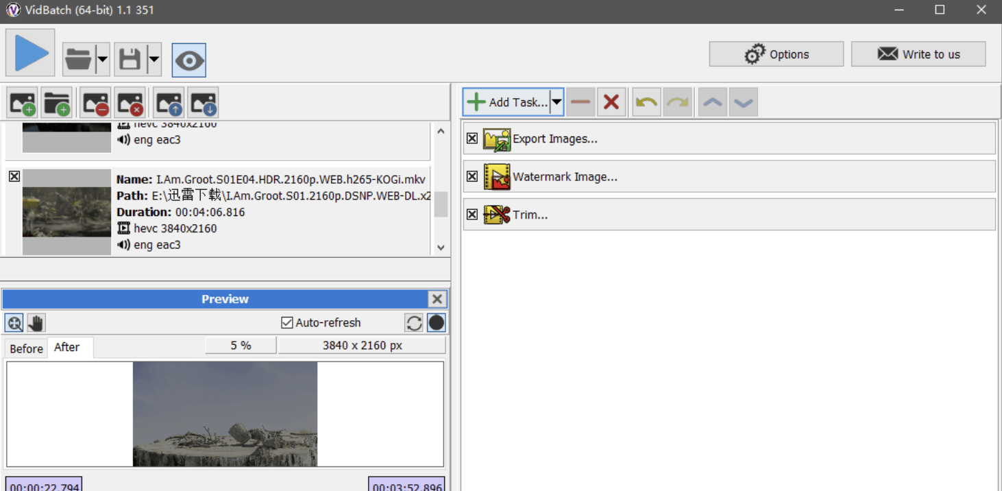 VidBatch 是一款免费的批量视频处理工具。首先,将需要的视频文件添加到处理列表中,然后添加任务,调整参数并一次处理一堆视频文件。