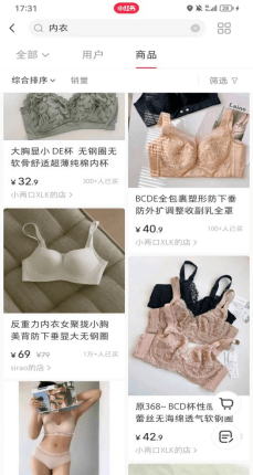 小红书搜索内衣,有三大栏目:全部,用户和商品,我们选择定到商品栏目,查看普通店铺(旗舰店不作为参考对标,参考旗舰店没有意义)的内衣销量,一般能够排得比较靠前的,都是销量高的商品,我们选择一款月销量10000+的产品,作为选品,先把款式截图下来,然后到拼多多或者淘宝选择图片识别,找到同一品类的产品,然后从这些渠道把商品的图片素材保存下来,淘宝和拼多多的商品图片可以直接保存,没有任何的水印,有了商品图片之后,我们就要准备商品详情页的素材了。