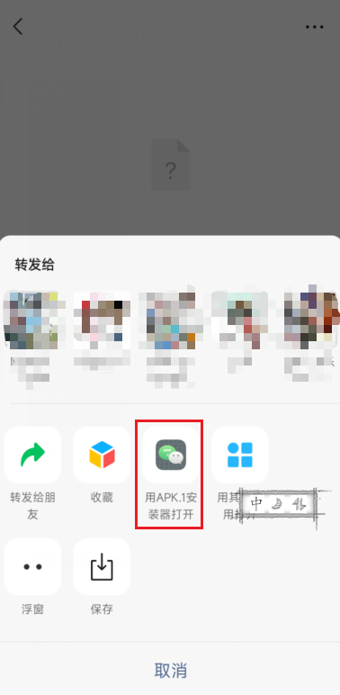 QQ安装界面(刚刚试了一下,TIM也是可以,步骤和QQ一致,也是点击 用其他应用打开,然后找到 “安装APK”)