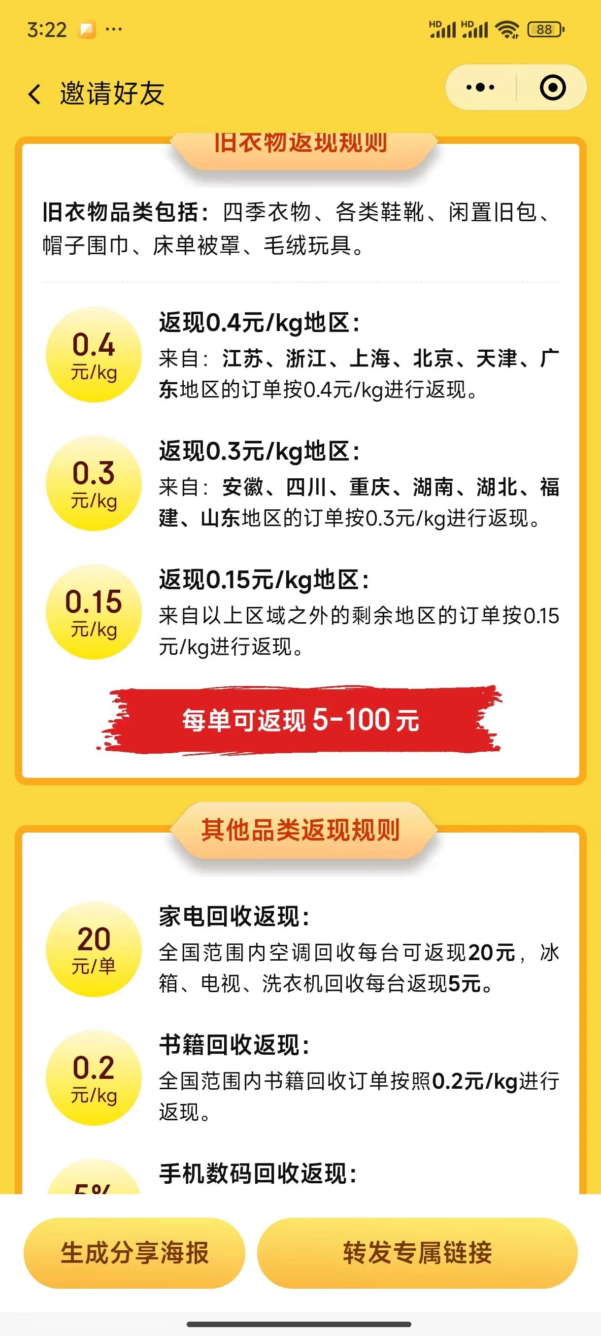 几乎每个家庭都有旧衣服,大部分旧衣服只能扔掉,现在旧衣物可以回收变现。快递员全国范围内免费上门回收,衣物根据区域和重量结算。自用可旧衣物折现,推广用户回收旧衣物,可以获得分佣。可以到小区公告栏张贴,或者业主群里分享。是一个可以长期做绿色管道收益的项目。除了旧衣物,其他也可以回收。具体看下图