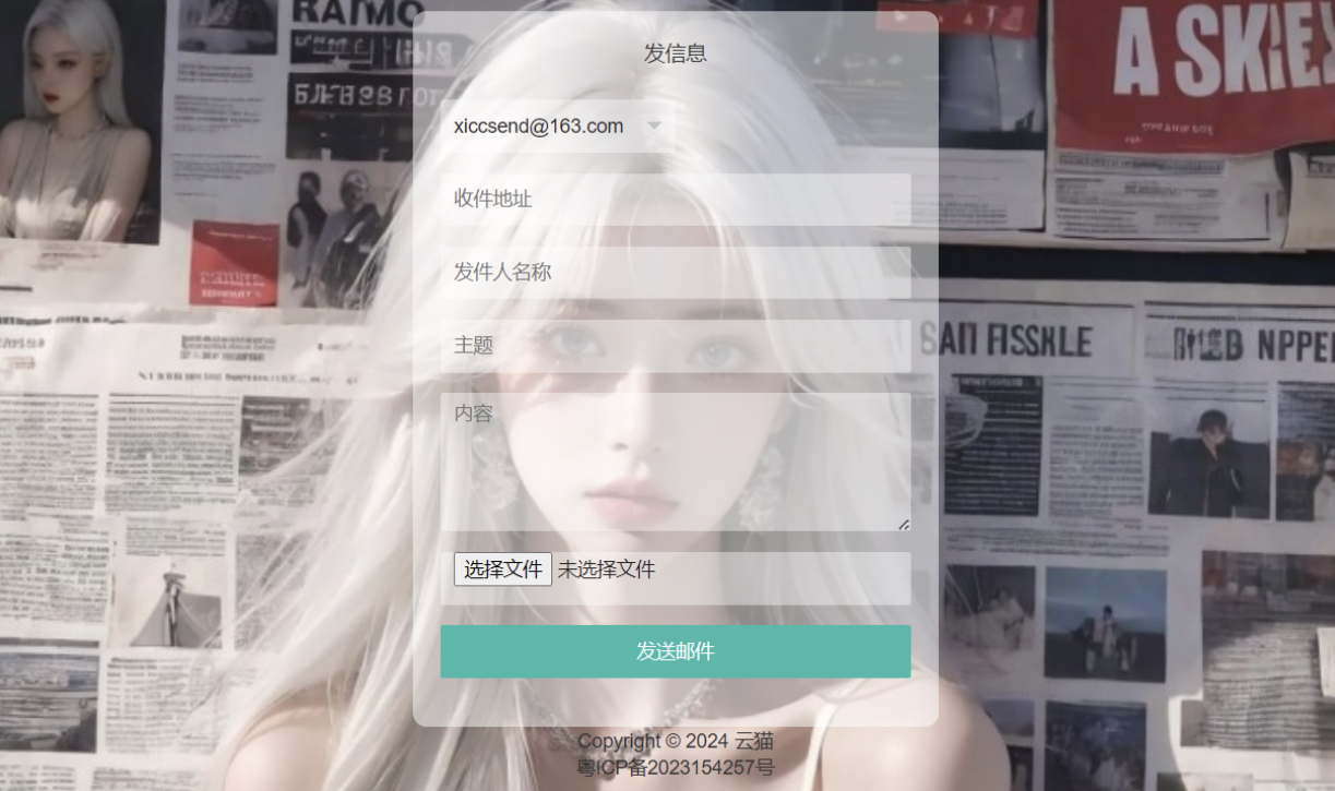 一款免登录发送邮件,支持发送附件,后台可添加邮箱,前台可选择发送邮箱
