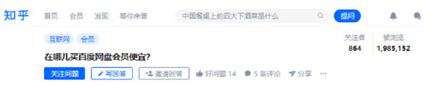 像这条问题,从用户的角度出发,就是带超强需求性的话题,提到怎么买百度会员便宜。关注人有800多,访客量高达198万,或许只要布局好这条问题,流量后面都源源不断来了。
