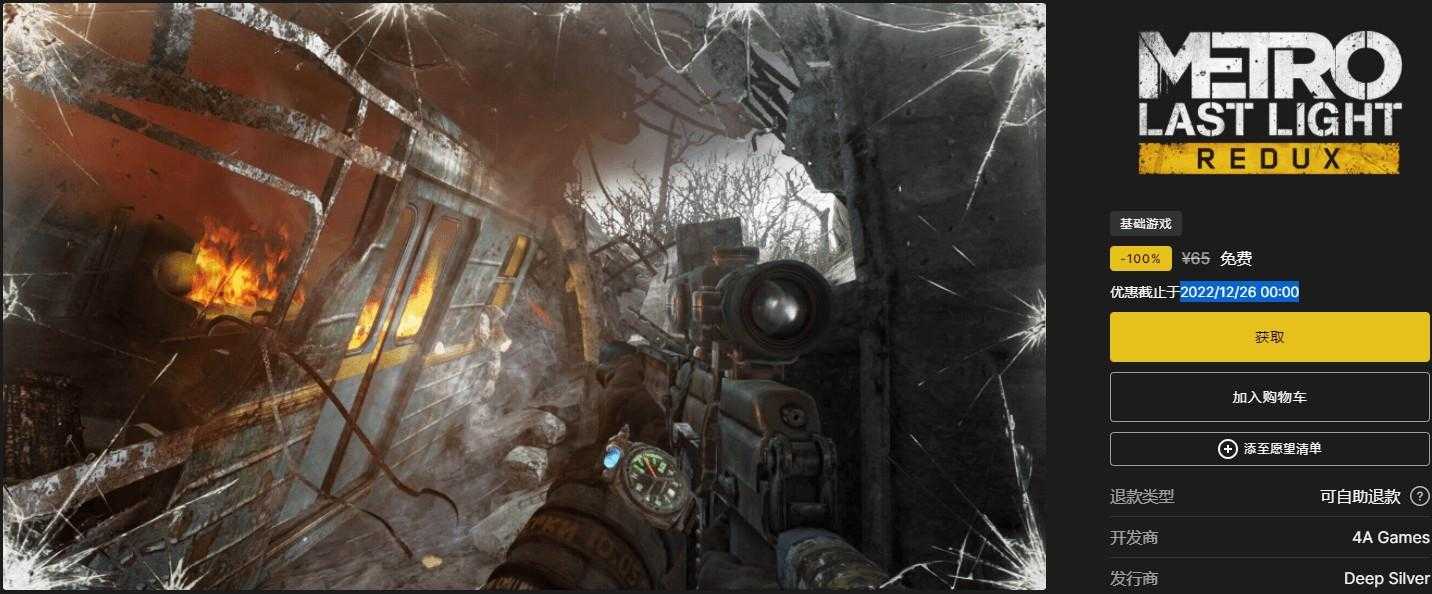 领取地址:https://store.epicgames.com/zh-CN/p/metro-last-light-redux