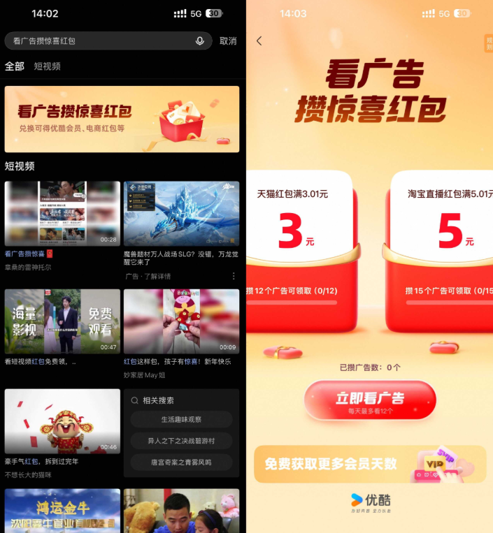 - 03-29 优酷每天看广告领会员或红包
