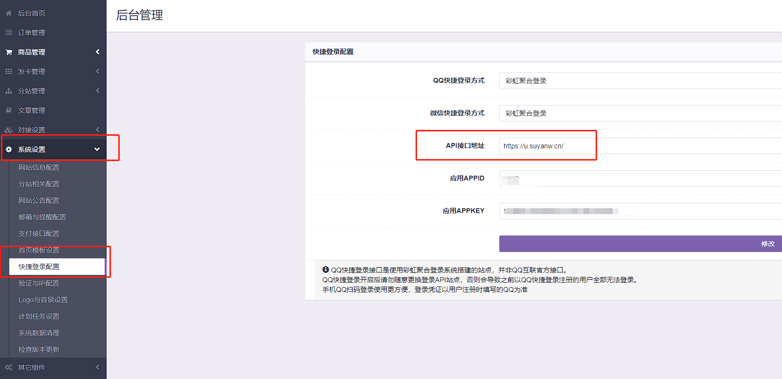 由于代刷网行业特殊用代刷网去申请 QQ 官方的互联那是不可能通过的,只能用现有的或者别的网站去申请会导致部分代刷网运营者没有技术能力去解决,故此彩虹出了 QQ 一键登录接口是第三方 qq 互联 Api 分发的,只要在后台填上 Api 接口地址,应用 APPID,应用 APPKEY 即可正常使用 QQ 快捷登录功能。