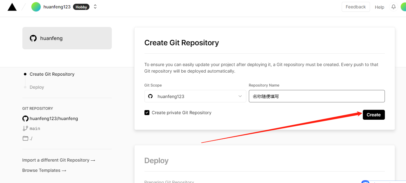 点击上方一键部署按钮的按键,就会直接会登陆Vercel网站,并提示必须创建 一个新的Git 存储库,输入储存库名称点击创建后,在下方配置项目的环境变量中填入(Vercel网站是英文的可以自行翻译)