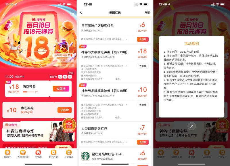 美团APP搜索“18”->直接领取38减18元和25减10元外卖券,券仅限5月18日当天可用