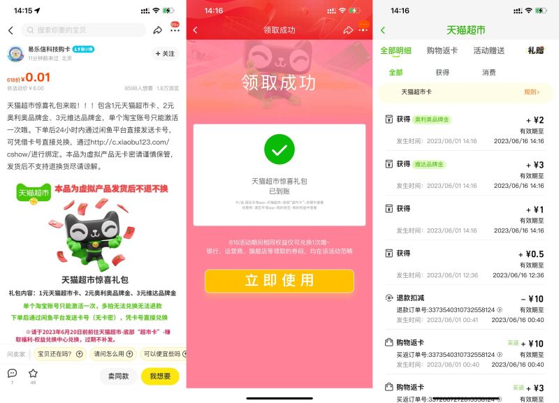 咸鱼0.01元撸1元天猫超市卡