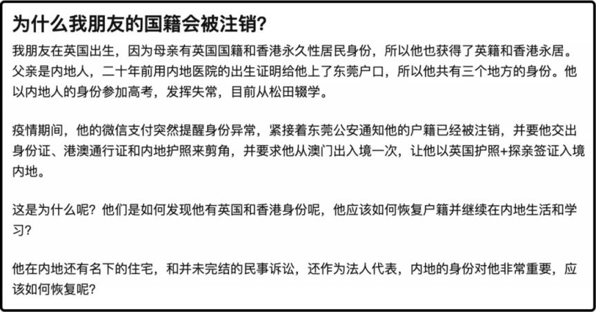 起因是在知乎看到一个主题,为什么我朋友的国籍被注销了。一般看到这种句式,默认就是无中生友,这么私密的事一般也不会有朋友到网上问东问西,看破不说破罢了。