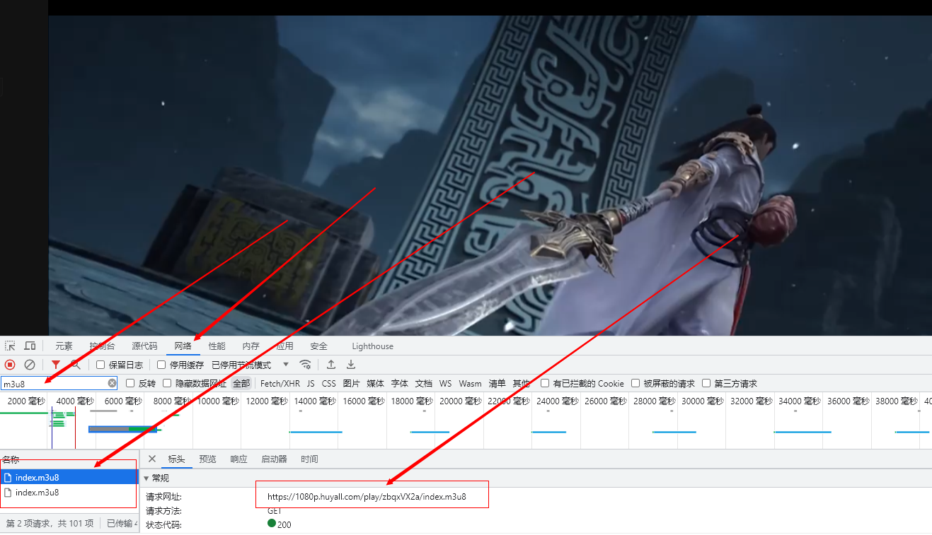 找到 network,输入 m3u8,过滤 m3u8 文件。