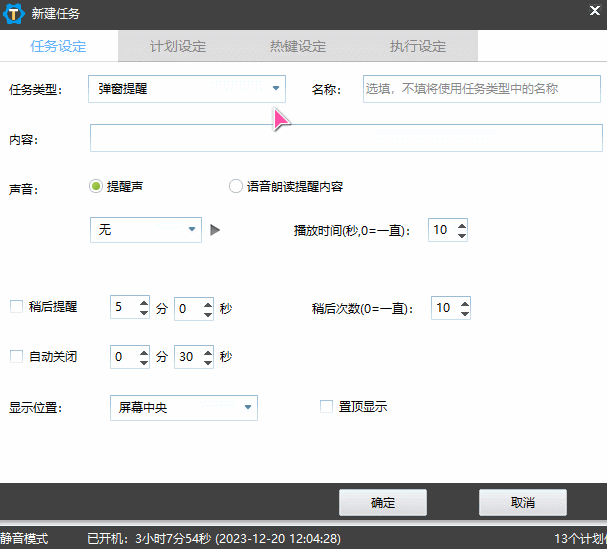 3.支持多种任务类型,如消息提醒、关机休眠重启等、挡屏休息、音量调节、静音,窗口、显示器控制;多媒体声音、整点/半点语音报时、截图、录音录像,程序、进程、服务等操作;更换壁纸,系统清理,网络操作,笔记本盖子状态等等更多类型