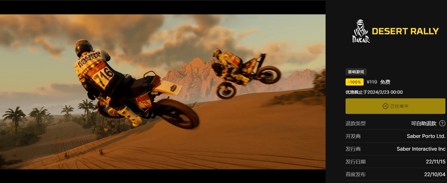 领取地址:https://store.epicgames.com/zh-CN/p/dakar-desert-rally