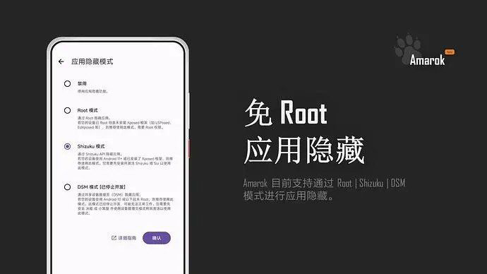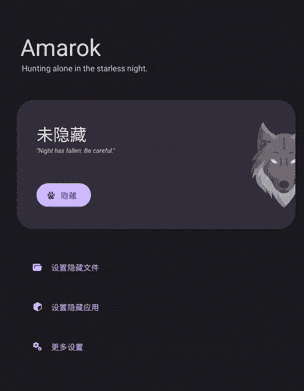 Amarok 是个轻量级隐私保护小工具,一键隐藏你的隐私文件和应用。支持 Shizuku、DSM 等模式隐藏应用。